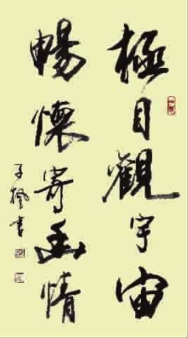 书法,是其一。“我小学就爱练书法,到了高中就荒废了。但是20年前,我又恢复起来。”60岁起,当他一人独处时,就会把纸墨笔砚铺就开来。如果兴致高,还会即兴作诗——诗词是他的第二大爱好。单纯书写别人的语句还不过瘾,自是自作诗歌更有情趣。他自己书写的诗句“极目观宇宙,畅怀寄幽情”(见左图②)既有宏观视野又有微观情怀。“我写字、作诗,都不是为了发表——俗!”他并不想当“书法家”:“中国古代哪有文人会成为‘书法家’,哪有动不动卖字的文人?”所以,“要说我的‘另一面’,那绝不可能成为书法家!虽然我很喜欢书法。”