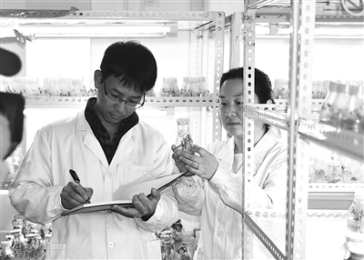 辛海波(左)开展万寿菊再生体系的建立工作