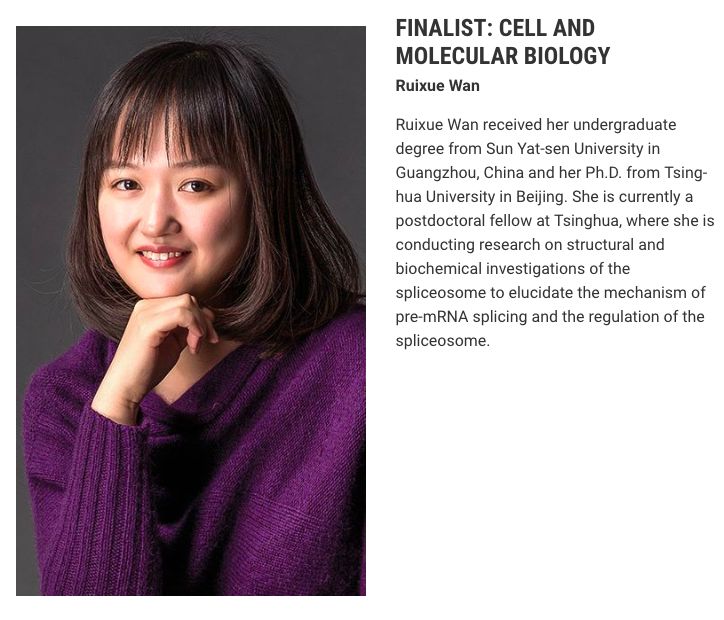 万蕊雪是近两年来清华大学非常耀眼的学术新星,主要专注于酵母剪接体的三维结构与分子机理研究,以共同第一作者身份发表了相关领域9篇研究文章(其中七篇发表于Science,两篇发表于Cell )。