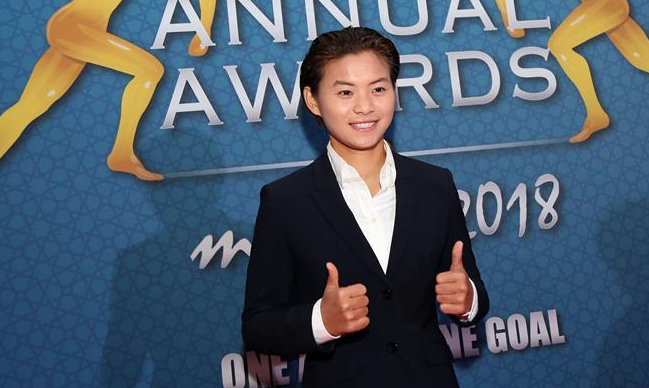 11月28日,王霜在颁奖典礼前留影。 当日,在阿曼马斯喀特举行的2018年亚足联年度颁奖典礼上,中国球员王霜当选亚洲足球小姐。