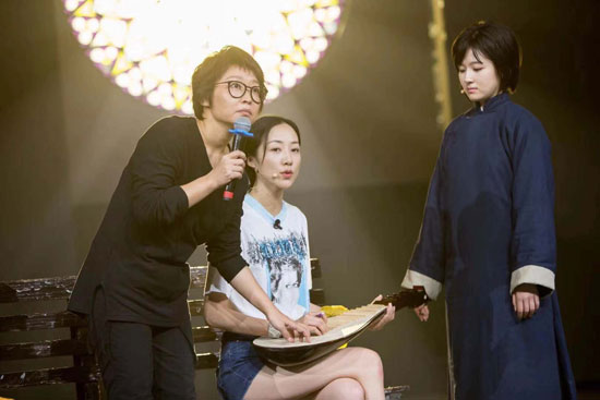 刘天池(左一)在指导演员韩雪、李兰迪表演。受访者供图