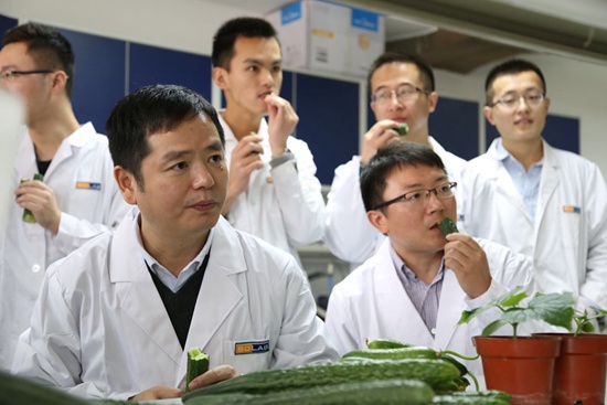 黄三文(左一)和团队成员一起品尝黄瓜。中国农业科学院供图