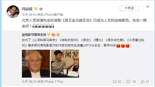 他的老朋友、中国文艺评论家协会副主席毛时安表示,白桦不仅有才华,而且十分儒雅,性格开朗,非常愿意接近年轻人。演员冯远征也发微博表示悼念,“先生一路走好!”