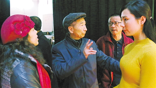廖华玉在吉水县采茶戏大赛舞台上与伴奏师沟通。