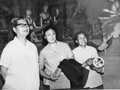 常书鸿(左)与李承仙(右)陪同黄宗英参观莫高窟。资料图片