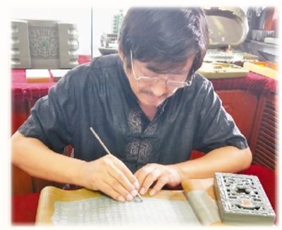 这石,是松花石;这砚,是康熙皇帝钟爱的松花砚;这刻砚的匠人,名叫刘祖林(见上图,本报记者孟海鹰摄)。