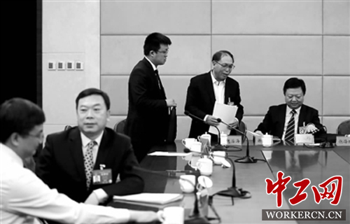 3月7日下午,富士康科技集团廊坊园区工会主席徐建华代表(右一)、张家口市农业科学院总农艺师赵治海代表(右二)、河钢邯钢三炼钢车间副主任周文涛代表(右三)在会后继续交流职业教育话题。本报记者 杨登峰 摄