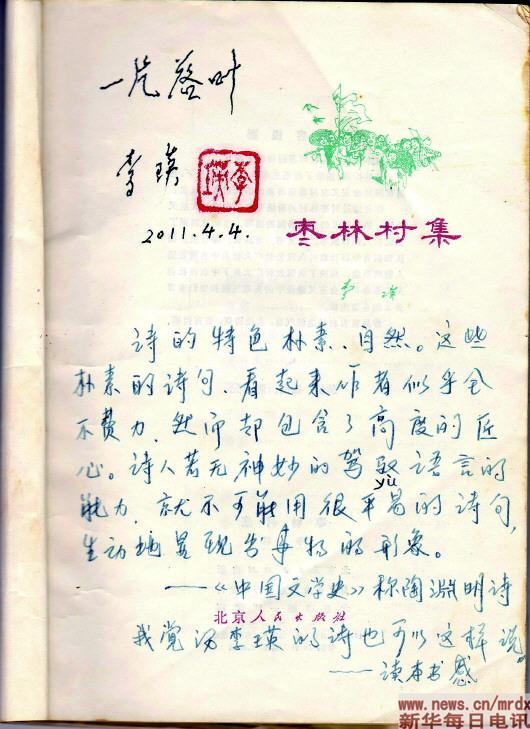 幸有2011年上中央党校专题班的机会。同学中有《诗刊》常务副主编李小雨,一打听,她居然是李瑛先生的女儿。于是回家,把那本早已变成暗黄色的《枣林村集》取出,郑重地给李瑛老前辈写了一封信,备讲这本书对自己的影响和情结,求老先生能在这本书上签个名。小雨大姐说,他年龄大了,身体不太好,我试试看。