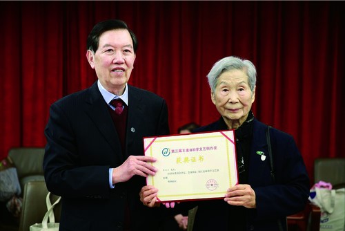 王麦林先生(右)向第三届“王麦林科学文艺创作基金”获奖者郭曰方(左)颁发获奖证书