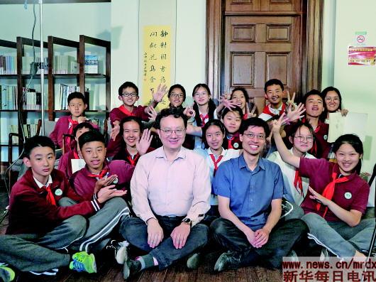 《科技袁人》主讲人袁岚峰(第一排中)与国际奥林匹克数学竞赛美国国家队总教练罗博深录制完节目后同上海延安初级中学的学生合影(2019年5月30日摄)。受访者供图