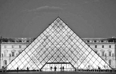 贝聿铭认为,这个“金字塔”应该是个美学光照下的几何形体的艺术造型,而不应该是真实金字塔的微缩;是以钢筋和玻璃为主角的精妙结构的“二重唱”,而不是任何混凝土的几何造型;这个结构既须体现出力学的高超,又应透露出美学的奥妙。那么玻璃的大小与厚度、钢筋的粗细与强度都在讲究之列。每块玻璃既不是圆形,也不是方形,而是菱形,这就使整个玻璃网格更加美观,更有灵气。经过贝聿铭的精心设计,确定玻璃金字塔的顶高21米,底宽34米。它的侧面和背面是喷水池,还有3个5米高的小金字塔(其雏形是前面提及的“三棱小锥体”)相护。它们一共占地约1000平方米,与卢浮宫原有建筑构成新的、具有反差审美效果的空间格局。这是技术与艺术、科学与美学高度结合的杰作。