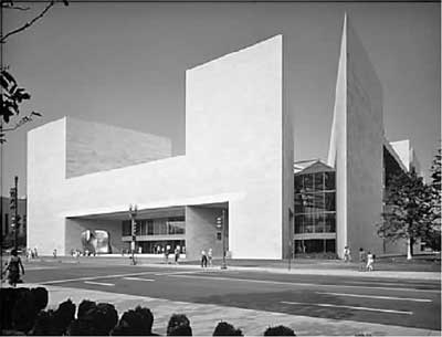 华盛顿原来已有一座国家美术馆,随着形势发展,现在要在其东侧扩建一座新馆。那里已准备好占地3.64公顷的不等边矩形斜坡。贝聿铭极睿智地朝着它的对角线一刀切开,他将大块的那个三角用作艺术馆的主体部分,即艺术品展览厅;小块的留作艺术研究与行政管理用房。建筑正面的艺术馆的入口非常宽大气派。它与另一座小三角的建筑之间留下一道凌厉的切口,极具视觉冲击力,足见设计师审美视角的犀利(但你不必担心二者之间“以邻为壑”,它们在4层有通道相连)。