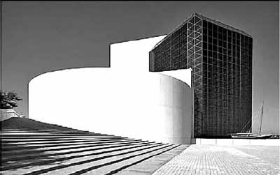 还有一点值得一提:东西馆之间的广场以美观的花岗石铺就。贝聿铭在它的中心部位铺上了他爱用的光滑的鹅卵石,并设置了一组美妙的建筑小品:喷泉、水幕和5个大小不一的三棱锥体(它们也是地下餐厅的天窗),恰似大海上的一群鲸鱼在奔逐。这组小品特别是那一组三棱锥体值得注意,它为十年后卢浮宫玻璃金字塔埋下伏笔。