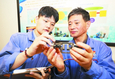 南京晨光集团公司航天伺服机构总装测试部特级技师王南石(右)。本报记者 董家训摄