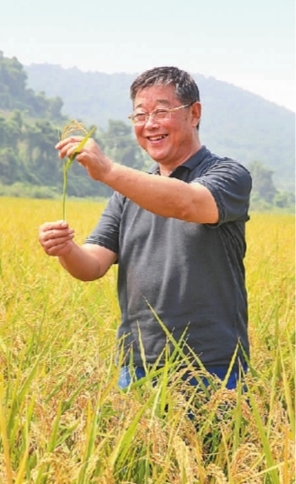 赵亚夫在田里向农民介绍有机水稻。许应田摄/光明图片