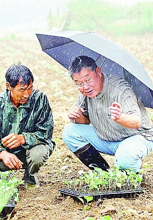 赵亚夫冒雨指导农民耕种。许应田摄/光明图片