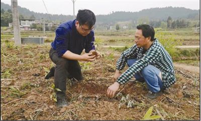 田孟良(左)在遂宁市指导村民防治黄精病害。四川农业大学供图