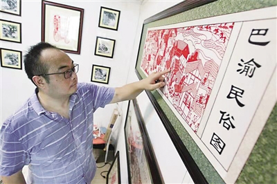 当然,除了基本功,一幅好的剪纸作品需经历选材、设计、构图、刻画,方才可成形。昨天,记者见到了他耗时一年半才完成的《巴渝民俗图》,其采用宣纸和绫布作为材质,长约1.8米、宽44厘米,描绘了嘉陵江畔老重庆街景的繁华景象。