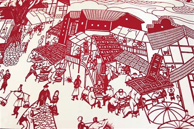 记者看到,《巴渝民俗图》剪纸整体成形,重庆棒棒、磨刀工、算命先生等传统职业人展现在画卷中;还有喝茶、乘凉、剃头、打麻将等生活场景;而小面摊、豆花馆、火锅馆等各式老店铺,更呈现出浓郁的山城特色。
