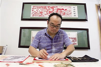 “刻刀剪纸有个技巧,必须时刻保持刻刀与纸面呈90度直角,不然的话斜刀会使宣纸受力不均,剪纸图案变形不说,刻刀刀尖也可能被压断。”黄涛说,这是个熟能生巧的活路,初学者别想一步到位。