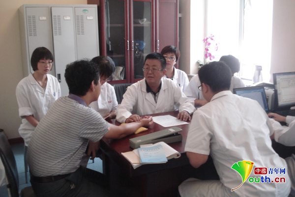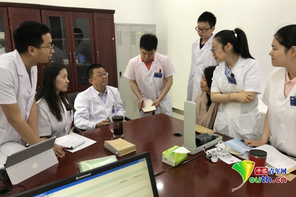 曹洪欣(左三)在给患者和博士生们讲授病情与诊疗方法。中国青年网记者 方瑞摄