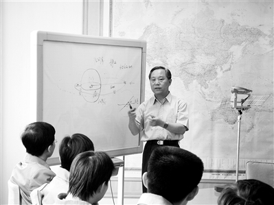 上图为资料照片。李济生院士在为技术人员讲授卫星测控技术。