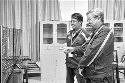 图为谢军(右)在和同事讨论卫星测试数据。南勇摄
