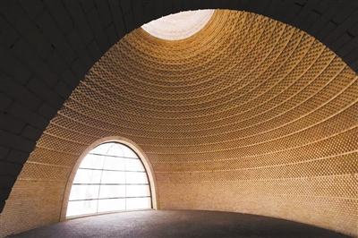 “这个设计对于结构工程师是个巨大的挑战。”丁永君感叹,这个建筑每一块砖之间都有一个夹角,使得整个建筑无论从外面还是里面看,都能看到砖转角流畅而美观的线条。同时,还需要在这个只有10米高,最大直径12米到15米的建筑上,开出3个拱形孔刺,拱形孔刺的底部宽度分别为5米、4米和3米。太阳光通过最上面的天窗射入,投影在内墙壁上会根据太阳的位置形成不同的图案。
