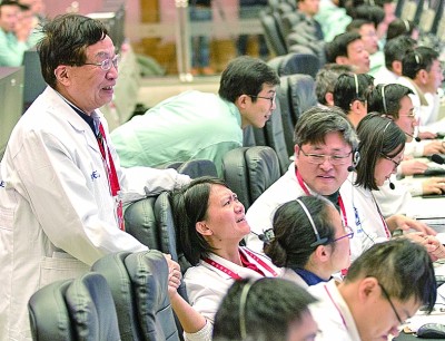 2019年1月3日,嫦娥四号成功落月的那一刻,叶培建院士(左一)对嫦娥四号探测器项目执行总监张熇表示祝贺。新华社发