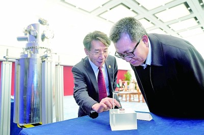 2019年12月23日,薛其坤院士(左)向中国国家博物馆馆长王春法介绍清华大学捐赠的科学仪器。新华社发