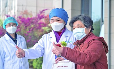 在武汉大学人民医院东院区,李兰娟院士(左)与出院患者合影。新华社发