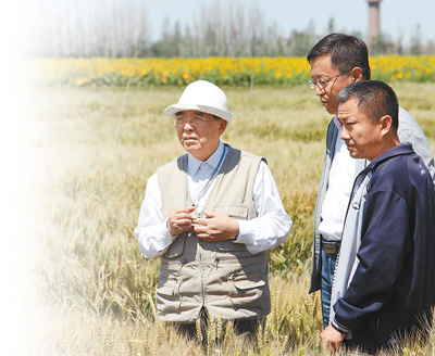 程顺和(左一)在新疆察看小麦长势。资料照片