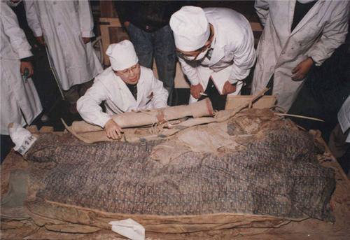央视网消息:在新疆民丰尼雅遗址的古墓群中,精绝王双人合葬墓的木棺正在被缓缓揭开。一条锦被上覆满了细沙,还有密密麻麻的褐色蛆壳。两具干尸底部的衣物和棺底厚厚地板结在一起。如果想要提取两人底部的衣物,就一定要把棺底旋转过来才可以。王亚蓉和考古人员轻轻地将二人分开处理,然后把裹在上面的衣服褪到两边,重新填上海绵并固定木棺两边的框架,棺底才得以迅速翻转……
