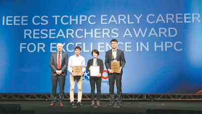 2018年,甘霖(右一)获国际电气和电子工程师协会“高性能专委会杰出新人奖”。国家超级计算无锡中心供图
