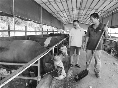 科技特派员文丰宽(左)在养牛场指导王神祥养牛王游明摄