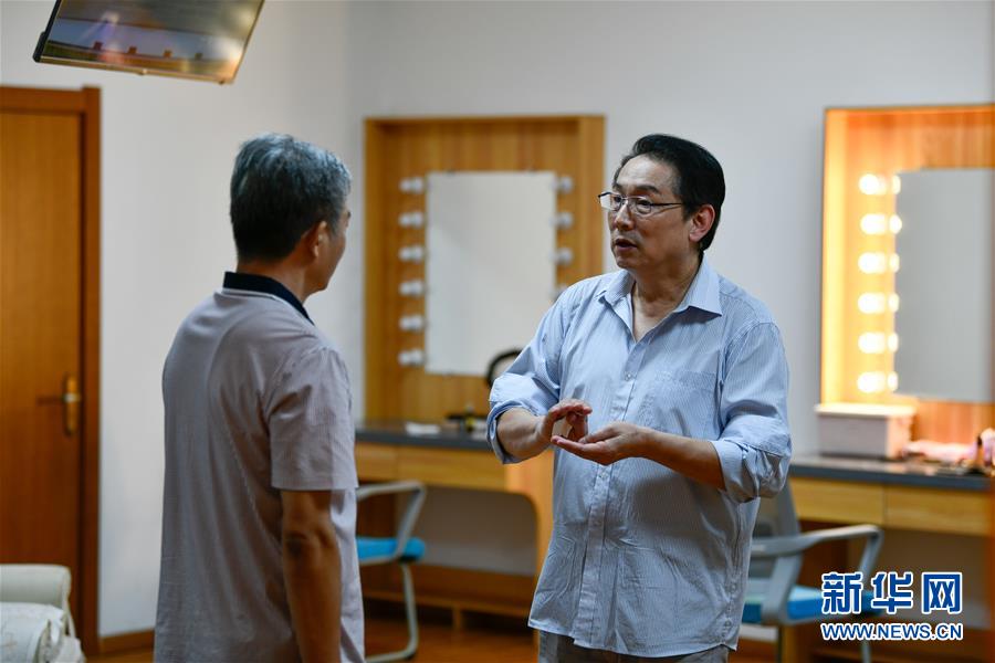 在天津市河西区光华剧院的化妆间里,王继世在演出前与剧院人员交流话剧台词(9月8日摄)。新华社发(孙凡越 摄)