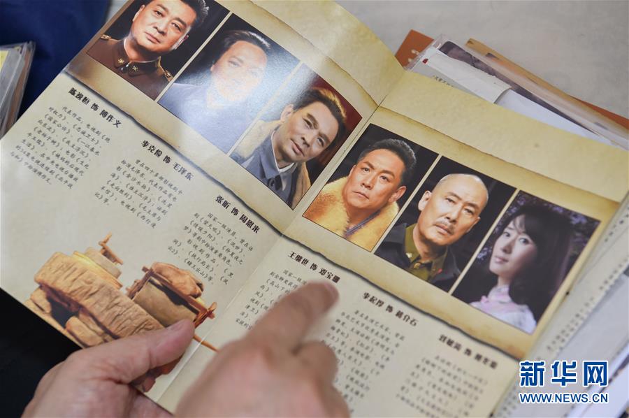 在天津市河西区光华剧院,王继世展示曾出演过的话剧角色定妆照(9月8日摄)。新华社发(孙凡越 摄)