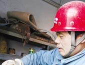 12月12日,记者见到韩丙合时,他正在埋头打磨辅助配件,寒冷的冬日里他的额头上却挂着汗水。“这个车间基本上不买辅助配件,全是自己做的。”看记者好奇,他自豪地展示众多宝贝,“这是锉剑,传送设备全靠它;这是鸳鸯剑,设备配合不恰当或者买的配件不合适,用这个来解决;还有导风叶片、刮板擦、喷口环盖板……做生产就是得有让设备转圈的本事。”