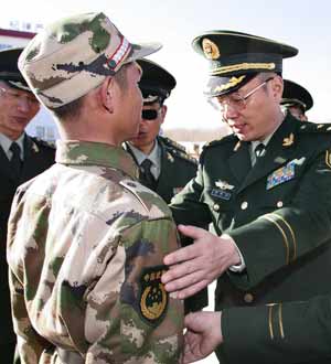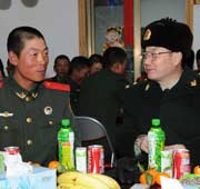 2009年12月郭毅力视察新训工作,对新兵军姿进行纠正。