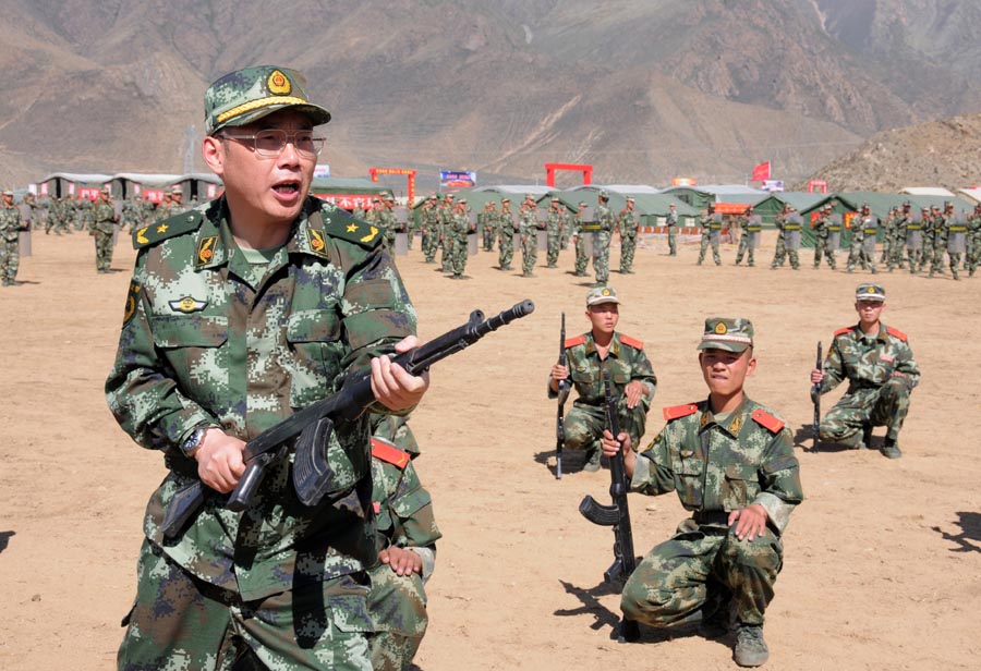 2013年郭毅力在区域训练基地视察时,向驻训部队官兵进行刺杀动作示范。