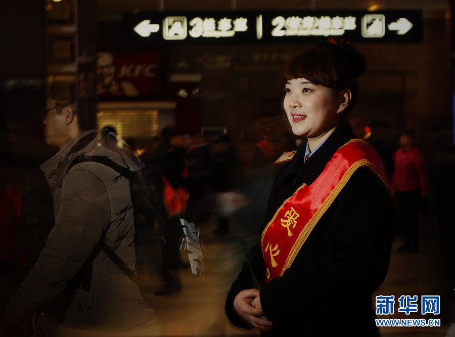 栗秀媛,山西大同人,北京站迎宾客运员。她的主要工作是维持站厅的秩序,引导老幼病残孕等重点旅客。“男朋友在家乡做生意,一年到头能见面的机会很少。春运的时候,看着一车一车的旅客能够回家团聚,我们却不能回家,也挺痛苦的。不过,能够让旅客踏踏实实回家,是我最开心的事。”栗秀媛在接受采访时说。2014年1月26日深夜摄。