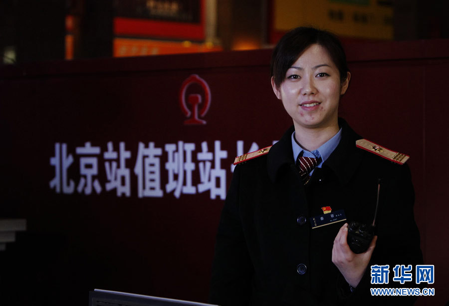 秦蓉,北京站值班站长。作为值班站长,要解答旅客的各种问题,协调处理突发情况,除了要对铁路的专业知识了如指掌,还要有一颗强大的内心。在记者采访的时候,一名醉酒的旅客,因为不知道自己在哪个候车室候车,在秦蓉面前大声吼着,而她却一直以笑脸相对。2014年1月26日深夜摄。