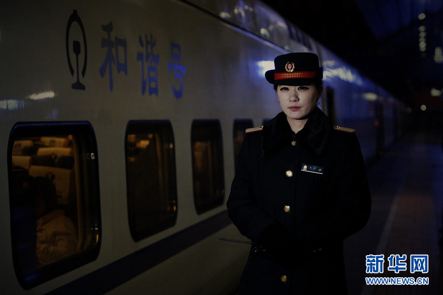 吴茜,北京站站台客运员。她的主要任务是维持站台的秩序,组织旅客上下车,保证旅客的安全。“特别要注意,不能让小孩跌下站台。”谈到自己的工作,吴茜觉得这一点尤其重要。2014年1月27日凌晨摄。