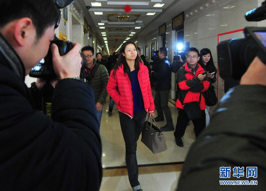 新华网照片,武汉,2014年1月27日 (体育)(1)网球——李娜返回家乡武汉 1月27日,李娜(中)走出机场。当日,在2014年澳大利亚网球公开赛夺冠的中国选手李娜返回家乡武汉,在机场受到家人和球迷的迎接。 新华网记者肖艺九摄