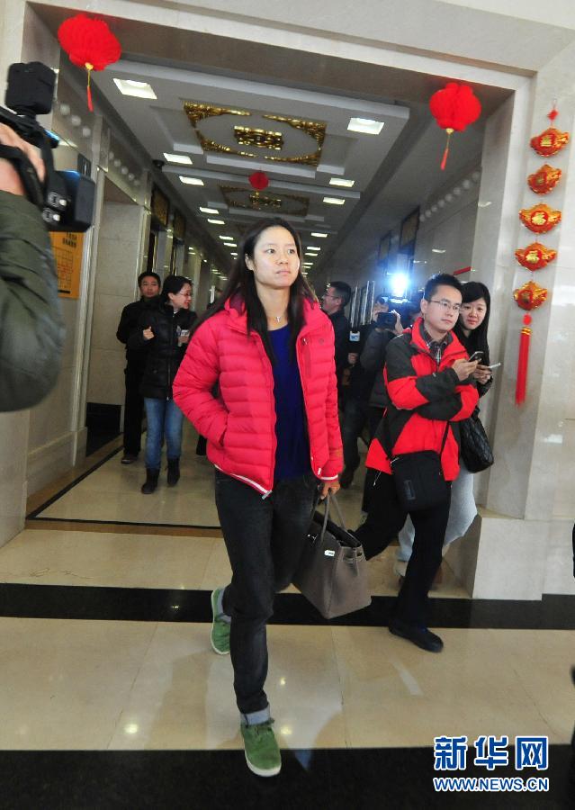 新华网照片,武汉,2014年1月27日 (体育)(2)网球——李娜返回家乡武汉 1月27日,李娜(中)走出机场。当日,在2014年澳大利亚网球公开赛夺冠的中国选手李娜返回家乡武汉,在机场受到家人和球迷的迎接。 新华网记者肖艺九摄