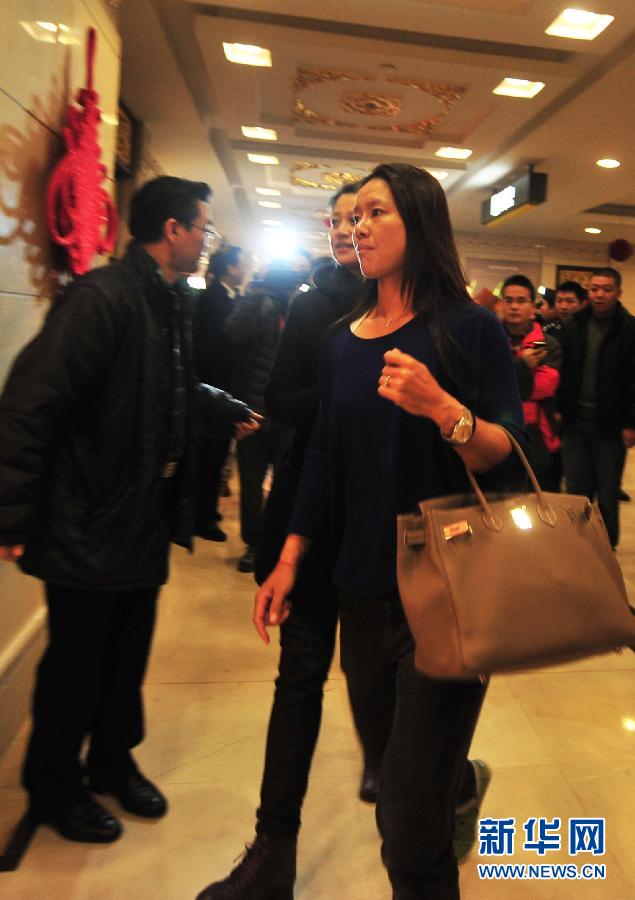 新华网照片,武汉,2014年1月27日 (体育)(5)网球——李娜返回家乡武汉 1月27日,李娜(中)走出机场。当日,在2014年澳大利亚网球公开赛夺冠的中国选手李娜返回家乡武汉,在机场受到家人和球迷的迎接。 新华网记者肖艺九摄