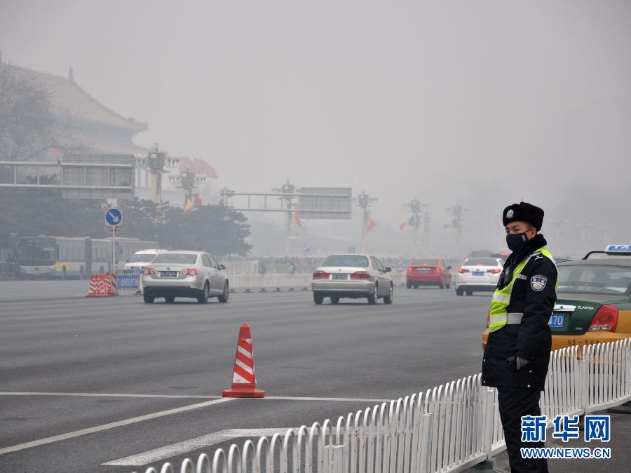 2月22日,一名交警在雾霾中的北京长安街执勤。连日来,我国中东部地区出现大范围雾霾天气。在雾霾笼罩的日子里,许多需要户外作业的工作者坚守岗位,为社会的正常运转奉献着自己的力量。新华网发(王俊峰 摄)