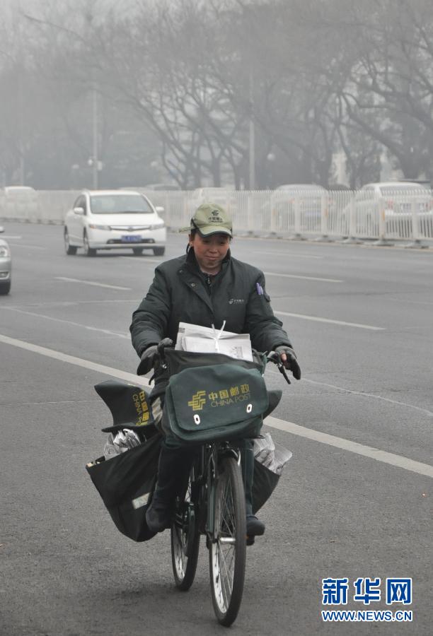 2月22日,一名邮递员骑行在北京长安街上。连日来,我国中东部地区出现大范围雾霾天气。在雾霾笼罩的日子里,许多需要户外作业的工作者坚守岗位,为社会的正常运转奉献着自己的力量。新华网发(吴国才 摄)