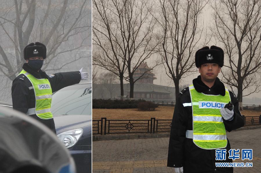 2月24日,北京市公安局交管局东城支队东四大队民警任永杰在执勤(拼版照片)。任永杰告诉记者,北京市重污染天气出现后,交通民警加班加点,增大路面交通疏导力度,确保市民出行安全、顺畅。同时,一线民警也都配备了口罩等防护设备,加强自身防护。当日,北京市空气重污染应急指挥部称,未来三天北京市重污染“橙色预警”仍将持续。为了降低雾霾的影响,许多市民不得不停止户外活动或尽量减少外出。然而,还有这样一群人,他们或穿梭于大街小巷,或置身于车流之中,用更加辛勤的工作,努力使雾霾天气对百姓生活的影响降到最低。雾霾下,他们依然在默默奉献。新华网记者 公磊 摄