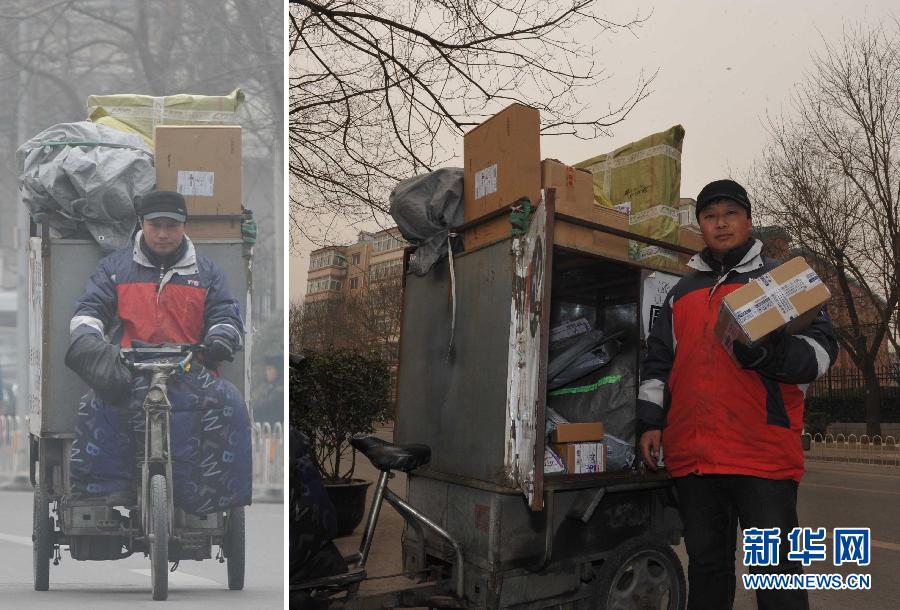 2月24日,快递员刘禹鹏在投送快递(拼版照片)。刘禹鹏对记者说,北京这几天空气重度污染,让许多市民减少外出而通过网络购物,在一定程度上增加了快递员的工作量。公司要求每一个快递员都要准确、快速地把快递送到顾客的手中。当日,北京市空气重污染应急指挥部称,未来三天北京市重污染“橙色预警”仍将持续。为了降低雾霾的影响,许多市民不得不停止户外活动或尽量减少外出。然而,还有这样一群人,他们或穿梭于大街小巷,或置身于车流之中,用更加辛勤的工作,努力使雾霾天气对百姓生活的影响降到最低。雾霾下,他们依然在默默奉献。新华网记者 公磊 摄